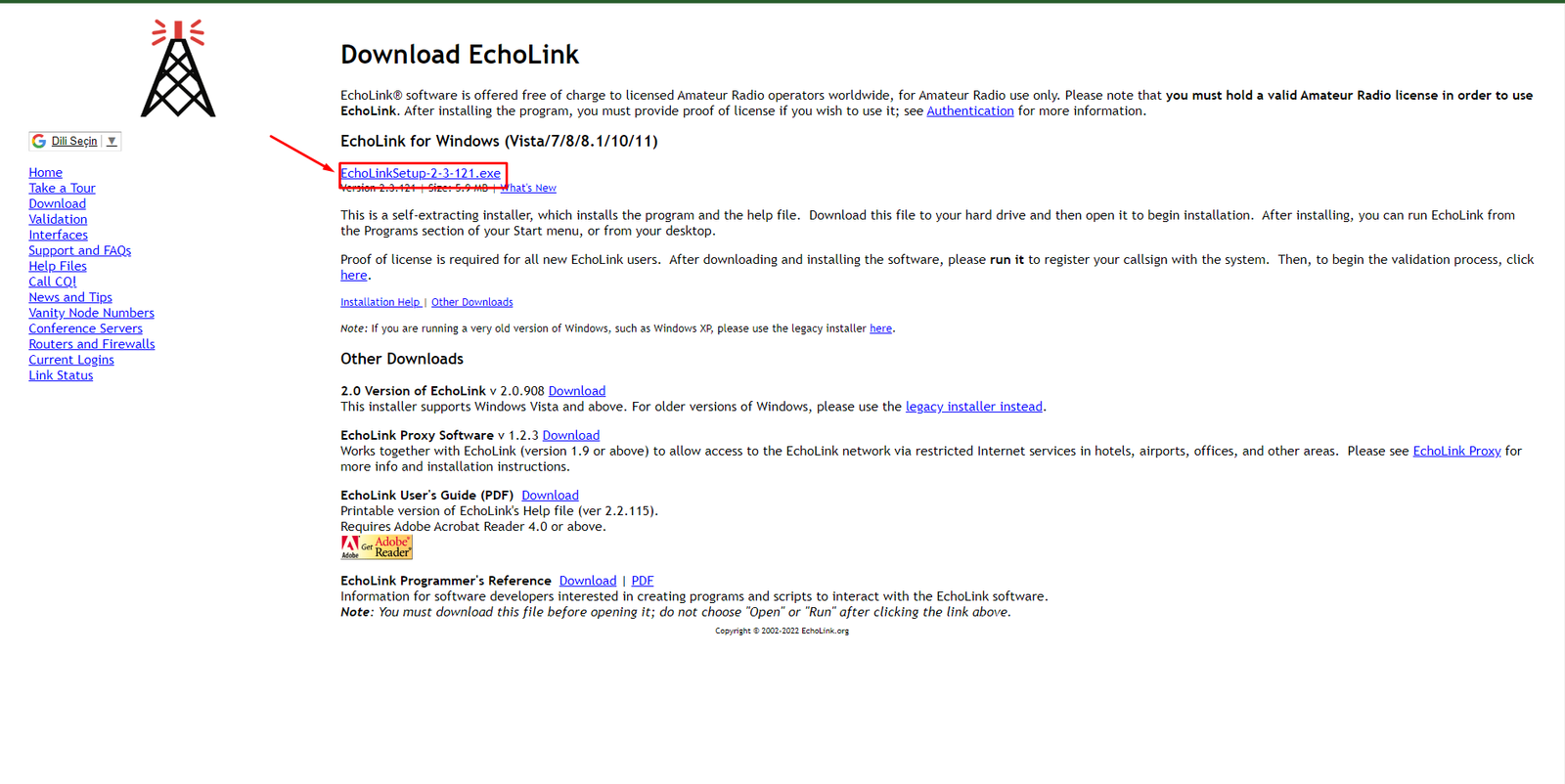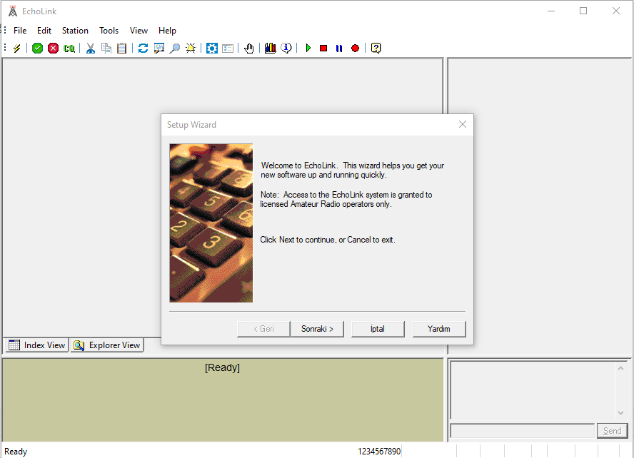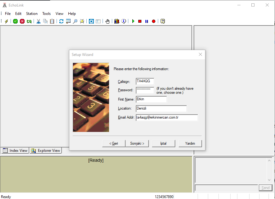 Bilgisayarımıza Echolink kurulum dosyasını indirdikten sonra çift tıklayarak açıyoruz, program açıldığında sizi yandaki gibi bir ekranla karşılayacaktır. Çıkan pencerede “Sonraki” tuşuna basıyoruz, 2.pencerede “Computer User” seçeneğini işaretleyip “Sonraki” tuşuna basıyoruz, karşımıza görseldeki gibi bilgilerimizi isteyen bir form çıkıyor yukarıdan aşağıya sırasıyla “Çağrı İşareti” > “Şifre” > “Ad” > “Lokasyon” > “E-mail Adresi” bilgilerimizi giriyoruz.