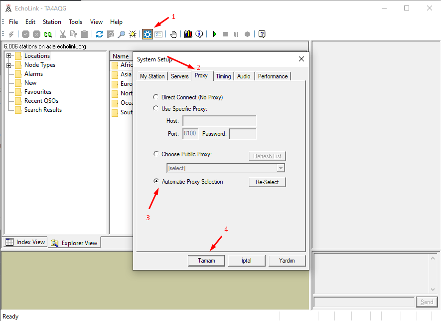 Bu sorunu gidermeden Echolink uygulamasında oturum açabilirsiniz fakat bir bağlantı gerçekleştiremezsiniz, sorunu çözmek için Echolink yazılımını açtıktan sonra sırasıyla “Setup” > “Proxy” > “Automatic Proxy Selection” seçeneğini işaretleyip “Tamam” tuşuna basmanız yeterlidir.