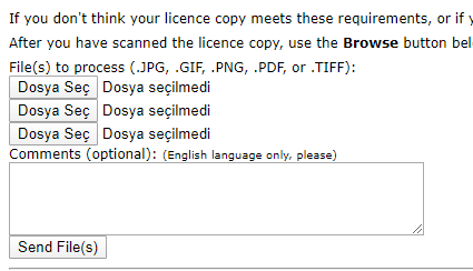 Açılan sayfada aşağıda yer alan “Dosya Seç” butonuna tıklıyoruz ve Kıyı Emniyeti Genel Müdürlüğü E-Hizmetler sayfasından aldığımız .PDF formatındaki lisansımızı seçip yüklenmesini bekliyoruz daha sonra “Send File(s)” butonuna tıklayarak onay sürecini başlatıyoruz.
