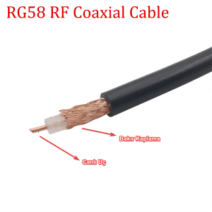 Anteni telsizimize bağlamak için kullanacağımız RG-58 kabloyu bağlamak için baskısını aldığımız 3D aparattan yararlanacağız. Bunun için ilk önce RG58 kablomuzun bir ucunu açmamız ardından canlı ucu ve kaplamayı ayırmamız gerekiyor. Yandaki görselden yararlanabilirsiniz.